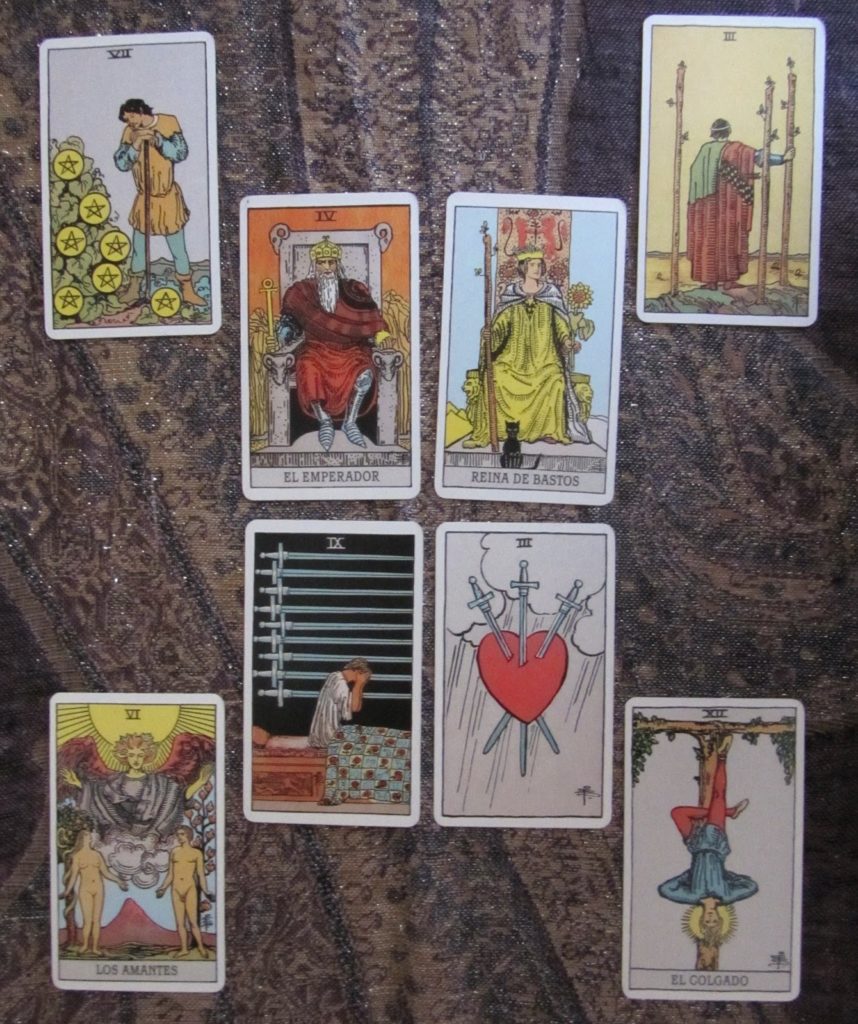 - La carta colocada en el centro representa el presente y se relaciona con la carta colocada a la izquierda.